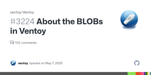 Der_Fossyler@feddit.orgEnglish · 10 months agoUpdate: About the BLOBs in Ventoy · Issue #3224plus-squaregithub.comexternal-linkmessage-square0linkfedilinkarrow-up11arrow-down10