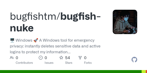 arrow-up11arrow-down1external-linkGitHub - bugfishtm/bugfish-nuke: A Windows tool for emergency privacy: instantly deletes sensitive data and active logins to protect my information during unexpected searches or house warrants.plus-squaregithub.comTablaste@linux.communityEnglish · 11 months agomessage-square0linkfedilink