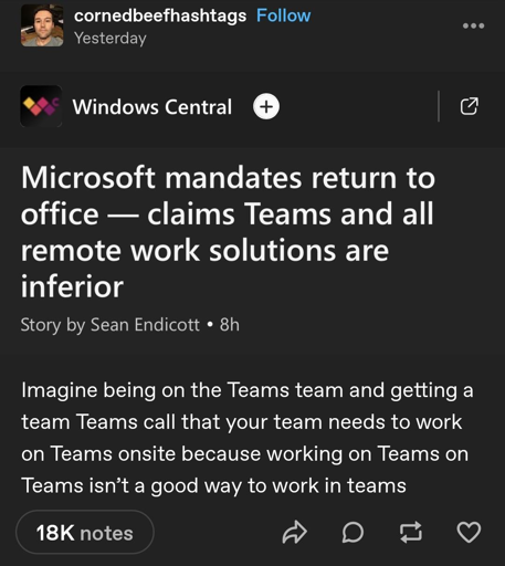 arrow-up11arrow-down1image"Teams is inferior to in-office". My brother in Christ, you made the applicationlemmy.caTheWaterGod@lemmy.caMEnglish · 6 months agomessage-square0linkfedilink