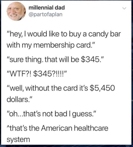 It misses the mark in that there is some candy that actually does cost thousands of dollars and if you don’t eat it and you have a certain condition then you will die. And if you cancel your members card then you won’t be able to afford it and the hospital is only legally required to give you a couple m&ms while you die if you can’t pay.