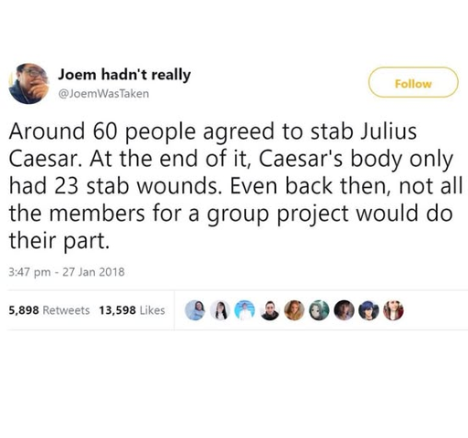 Tbf: If I were like at the back of the line, and I’d already seen Julius get stabbed 23 times, I feel like I just wouldn’t feel the need to chip in at that point