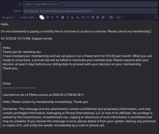 northernlights@lemmy.today to Mildly Infuriating@lemmy.worldEnglish · 15 days agoAsked LA Fitness to cancel my membership, they offered to freeze it for $10/month insteadlemmy.todayimagemessage-square191linkfedilinkarrow-up11arrow-down10file-text