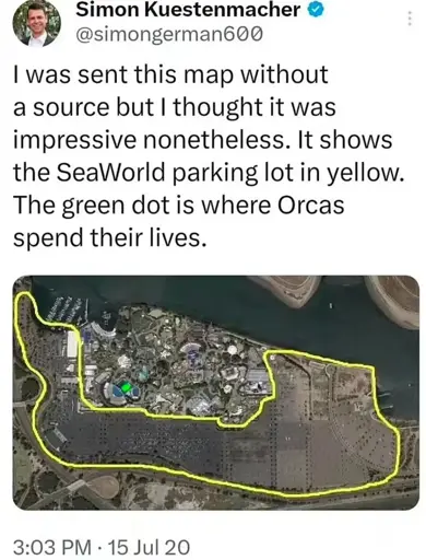 I was sent this map without a source but I thought it was impressive nonetheless. It shows the SeaWorld parking lot in yellow. The green dot is where Orcas spend their lives.