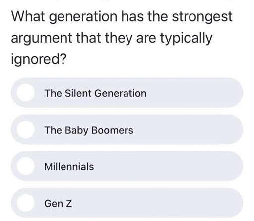 The Picard Maneuver@lemmy.world to Funny: Home of the Haha@lemmy.world · 3 days agoThe most ignored generationlemmy.worldimagemessage-square51linkfedilinkarrow-up11arrow-down10