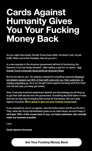 UnderpantsWeevil@lemmy.world to Not The Onion@lemmy.worldEnglish · 5 days agoCAH Gives You Your Fucking Money Backlemmy.worldimagemessage-square69linkfedilinkarrow-up11arrow-down10