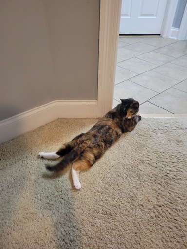 My cat prefers to lay on her side but stretched out like this. Then she’ll use her claws in the carpet to pull herself towards a toy or something because she is too lazy to get up.