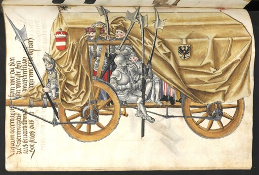 a wagon carrying weapons(nope, not “geer”, that’s “heer”, stop guessing) an army wagon to fight someone, probably for Maximilian (who seems to have owned this manuscript according to the additional data), and they’re petitioning God to make it so theydo something (probably fight and get back home)win honourably.It’s like I’m so close to being able to read it and then it gives me squiggly nonsense lines and quirky spelling, just to trip up me specifically and in particular. /c/mildlyinfuriating