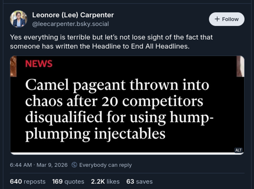 negativenull@piefed.world to Microblog Memes@lemmy.worldEnglish · 5 days agoUnrealistic Camel Body Standardsmedia.piefed.worldimagemessage-square12linkfedilinkarrow-up11arrow-down10