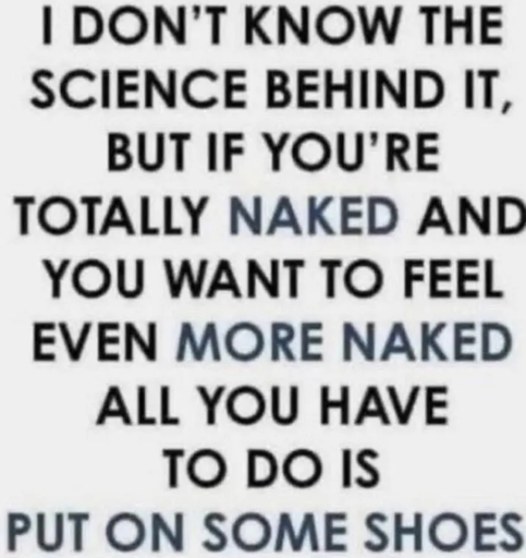 minus-squareTrackinDaKraken@lemmy.worldlinkfedilinkEnglisharrow-up0·3 days agoWith socks. Otherwise, you’re focused on the weird feeling of wearing shoes without socks.