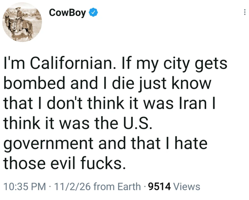 “Californian here and I’m telling you right now, I have so little faith in our government that if 9-11 happens again, I’m going to automatically assume FALSE FLAG.”