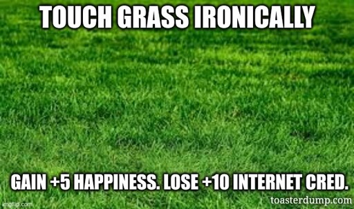 ToasterBotnet - Productivity and Memes@piefed.social to Funny@sh.itjust.worksEnglish · 17 days agoTouch Grassmedia.piefed.socialimagemessage-square18linkfedilinkarrow-up1190arrow-down14