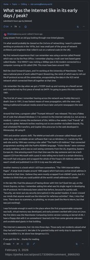 @elrainia@lemmy.world describes working on internet infrastructure back in the 1990s. This was on one of those “drive by” AskLemmys where a new user posts a juicy question, then after a couple hours they delete the topic and their account. However, those posts and comments are still visible in Piefed, ex: https://piefed.social/post/1733969#comment_9969293